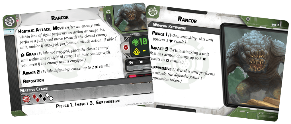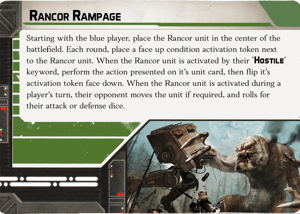 The Rancor will stalk the battlefield searching for its next meal. With this condition card, the Rancor will be placed in the center of the battlefield, making it difficult to achieve objectives, or reaching your opponent.