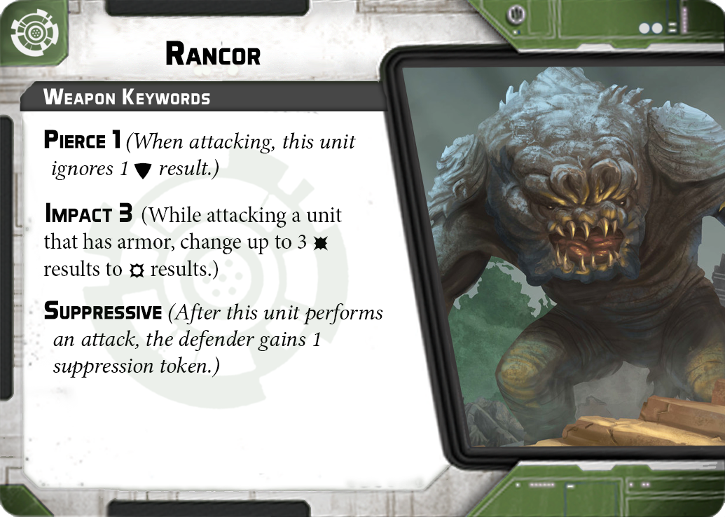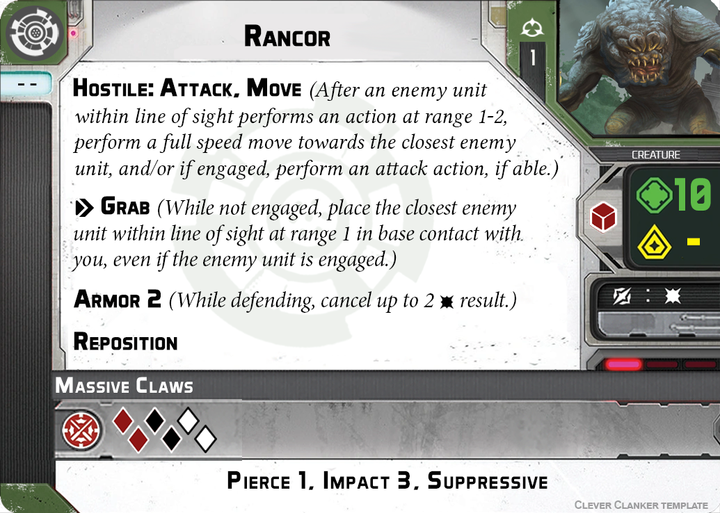 The Rancor will stalk the battlefield searching for its next meal. With this condition card, the Rancor will be placed in the center of the battlefield, making it difficult to achieve objectives, or reaching your opponent.