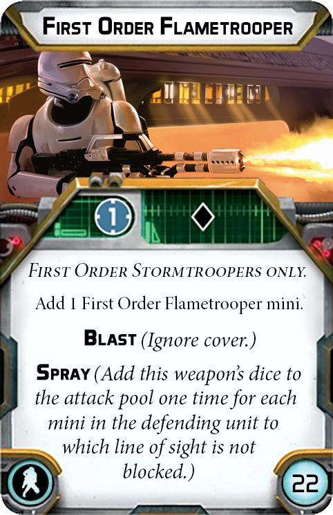 Armed with the F-11D Blaster Rifle, a direct upgrade from their imperial ancestor’s blasters, the First Order Stormtroopers are able to shoot more accurately. Members of this unit can include a First Order Flametrooper, and the rapid firing FWMB-10k unit. There are no troops in the galaxy as disciplined as the First Order Stormtroopers.