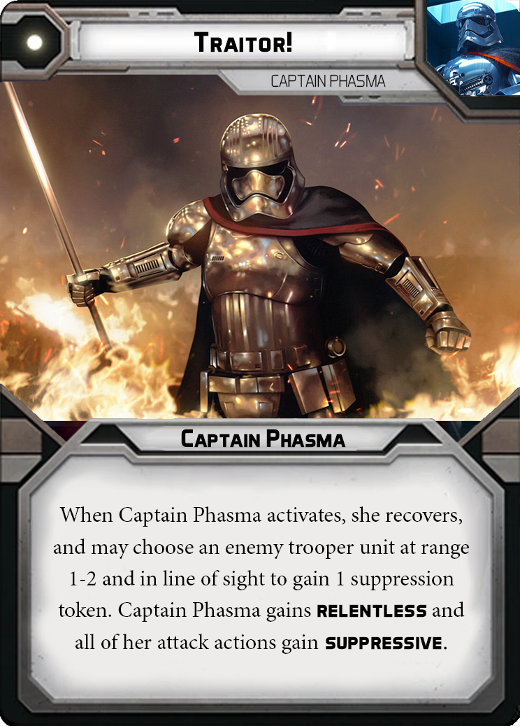 Phasma is equipped with a personalized F-11D Blaster Rifle, perfect for taking down resistance scum that may be attempting to hide. Her armor is also not just for show, the chromium adds an extra protective layer on top of the already sturdy stormtrooper armor making Phasma a tough opponent to take down. Being a talented leader, Phasma is able to compel her troops to think quick in stressful situations, and inspire them for doing a job well done.