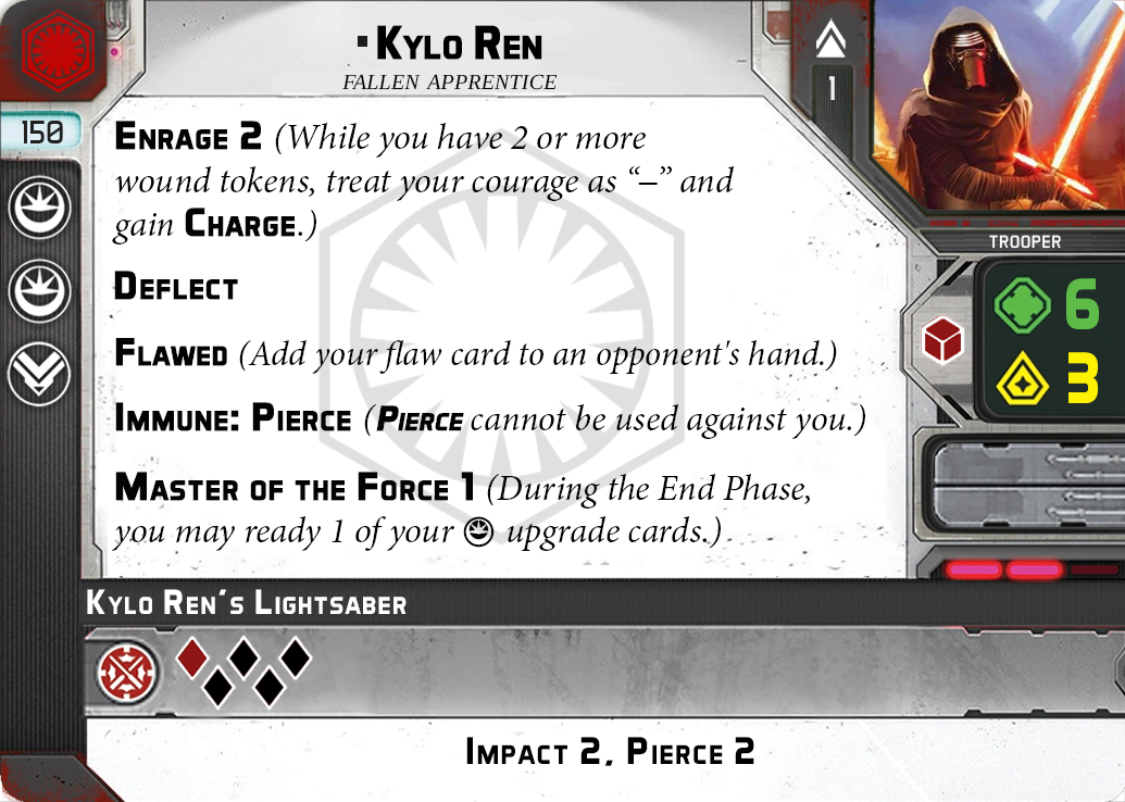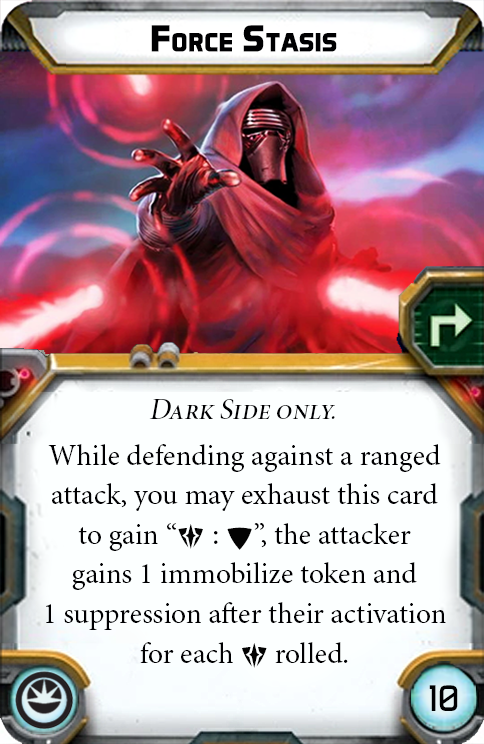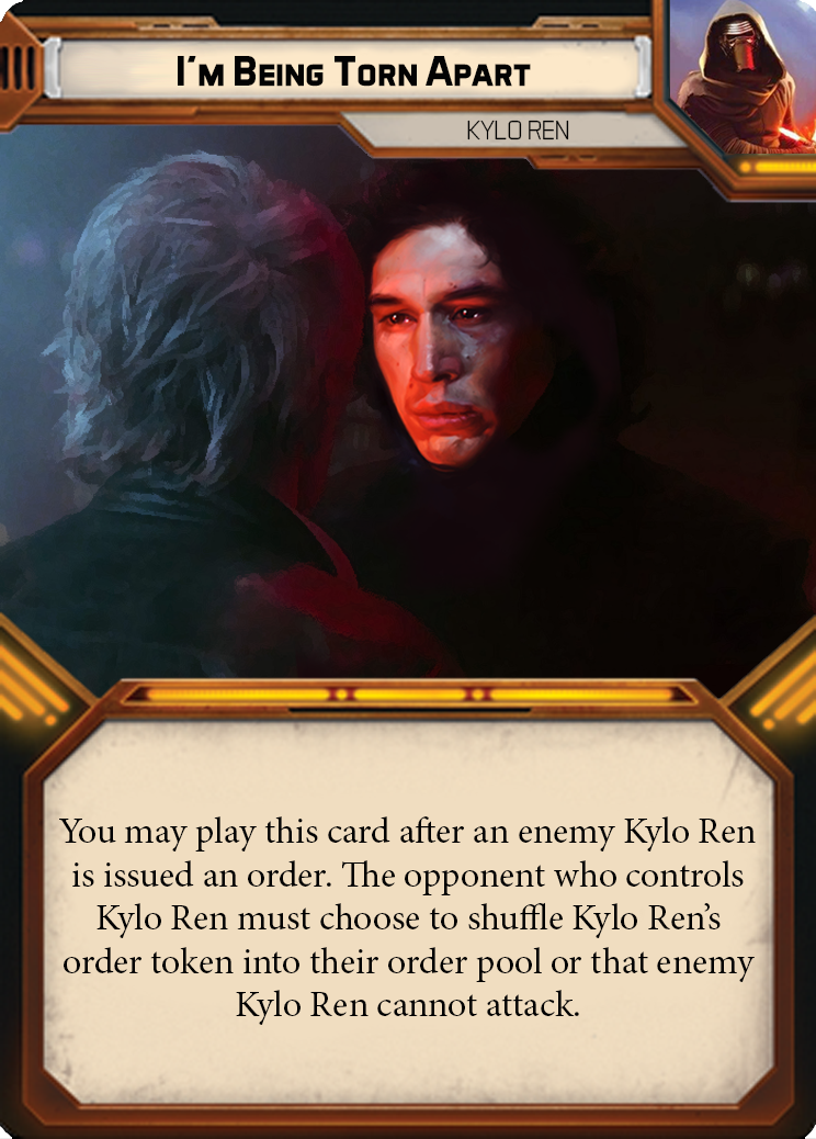 The constant pull to the light causes Kylo Ren to hesitate in certain situations. Kylo Ren’s flaw card I’m Being Torn Apart causes the player controlling him have to choose between Kylo not being able to attack that round, or causing Kylo’s order token to be returned back to the order pool. The choice the player has to make reflects Kylo’s constaant struggle with the light side and the dark side of the force.