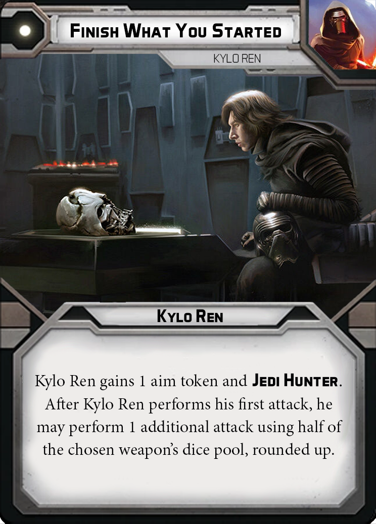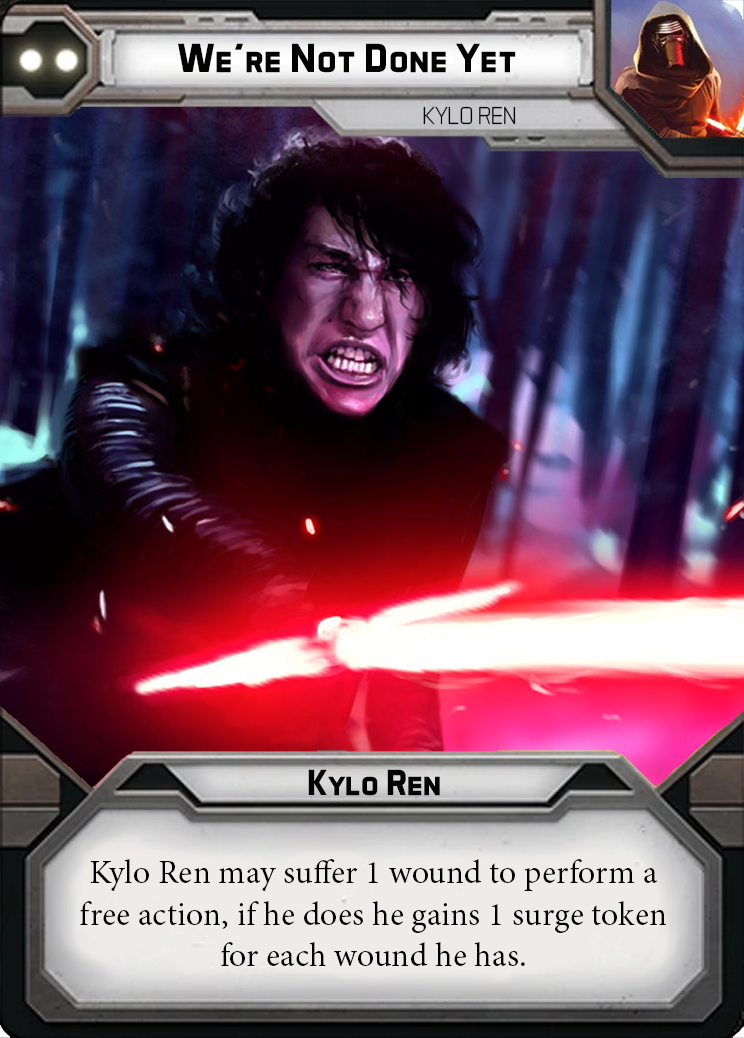 Rage and anger is something that considerably fuels Kylo Ren. As mentioned before with his obsession, Kylo wants to finish what Darth Vader started. To do this Kylo gains 2 surge tokens after he performs his first attack, he then may perform 1 additional attack with half his dice pool rounded up to finish off any survivor of his ferocious attack. Kylo Ren does not appreciate being ignored and will hunt down any opponent who flees from him. We’re not done yet allows Kylo to wound himself to chase his opponent for free. When he does this, Kylo gains surge tokens from his wounds.
