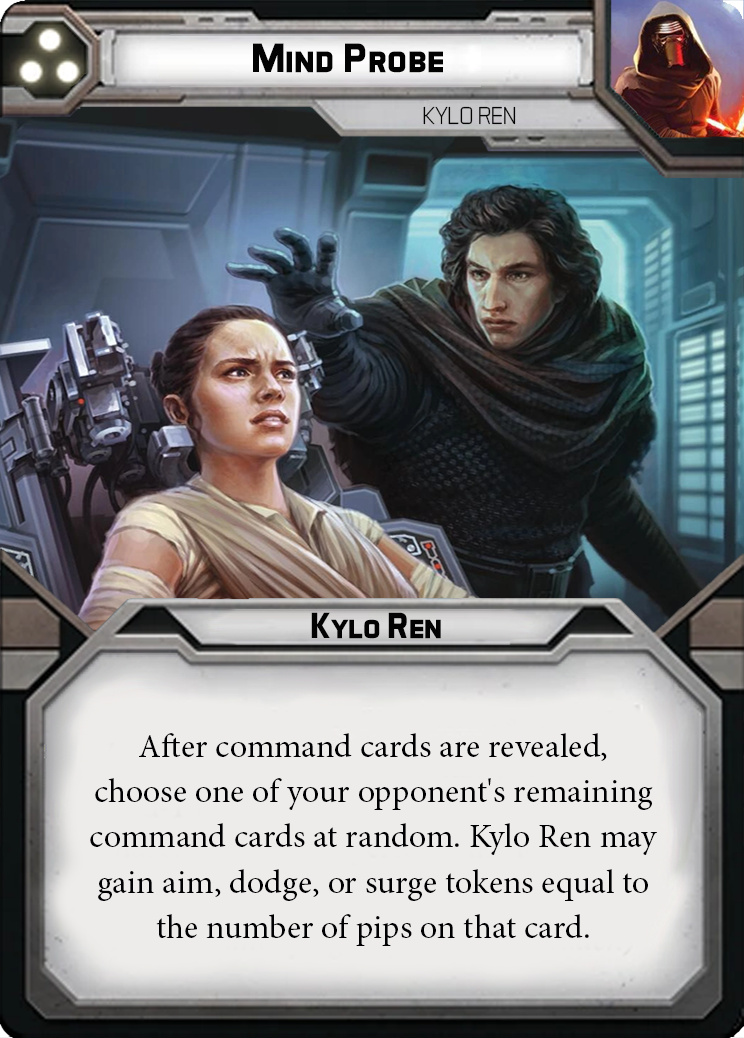 Interrogation is not an easy feat, many foes tend to be stubborn. This does not phase Kylo, for he has the power of Mind Probe, which allows him to gain the knowledge he seeks. The Mind Probe can be used on an opponent, granting you aim, dodge, or surge tokens equal to the number of pips on one of their remaining command cards.